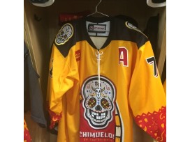These game-worn Chimuelos jerseys are the first of their kind, introduced at the start of the 2018-19 season as part of a team identity transformation in honor of Dia de los Muertos. A 'chimuelo' roughly translates to a 'toothless man', a playful nod to the missing chiclets in a hockey player's smile. These jerseys were worn on up to five occasions this season, representing San Antonio's rich Hispanic heritage on the ice at the AT&T Center.