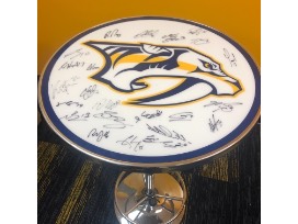 Pred logo used pub table from the Preds old locker room autographed by members of the 2017-18 Nashville Predators Team