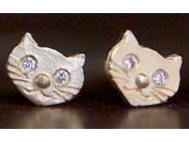 1This beautiful necklace and earring set designed by Victoria Cunningham will make you sparkle and show your love of cats. The kitty face necklace is made of 14k gold and has diamond eyes with a 16" chain. The kitty post earrings are made of 14k gold with Diamond eyes.