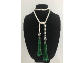 Extra Long Cream White Freshwater Pearl Necklace with Emerald Green Crystal and Marcasite Embellishment Tassel