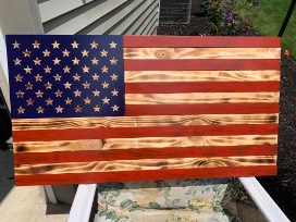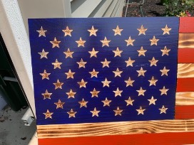 Beautiful handmade wooden American Flag. Size is 37" x 20". Notice the attention to detail with hand carved stars. Hang this on your wall or set on your mantle to show your patriotism.