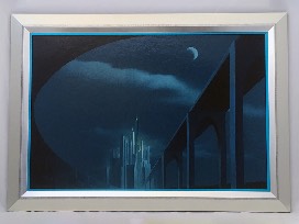 This original oil painting by Sylvia Bokor was completed in 1984. Titled The City, it is oil on illustration board.