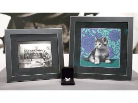 The second item is a kitten handkerchief measuring 11" square. The handkerchief has been carefully stitched onto a black velvet background and framed for display. Framed with a minimalist black and silver frame using archival materials. The overall dimensions of this deluxe framed piece are approximately 18" by 18".