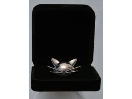 The first item is a sterling silver winking cat pin owned by Ayn Rand. The item donor saw Ayn Rand wear this pin while attending her nonfiction writing course. The pin's diameter is approximately 2". The back is imprinted: