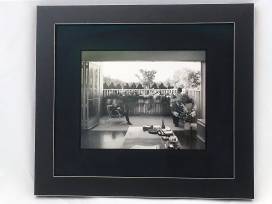 The photograph of Ayn Rand and Frank O'Connor was taken in 1947. They are standing on a patio of the Richard Neutra-designed von Sternberg house, built in 1934 in Chatsworth, California. Ayn can be seen holding one of her beloved cats. This print is also framed with a black velvet mat and minimalist black and silver frame (using archival materials). The overall dimensions of this deluxe framed piece are 16 1/2" by 14 1/2".