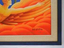 The print has been framed using archival materials, with an inner frame chosen to reflect the sweeping curvature of both the wings and the clouds. The iridescent metal outer frame precisely matches the blue sky background when viewed at the correct angle.