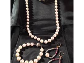 The necklace is 24 inches and the bracelet 7.5 inches. The necklace can be extended using the bracelet to 31.5 inches. Matching pearl and sapphire earnings included.