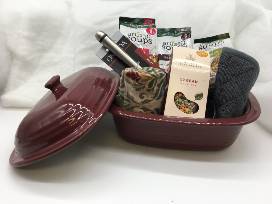 Warm up with this Cozy Kitchen basket: a Dutch Oven full of yummy soups.