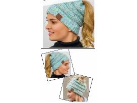 Messy Bun Ponytail Beanie - Light Cyan and multi-color Confetti Knitted Winter Hat - Comfortable and stylish beanie with ponytail hole; keep your hair up while keeping your head warm