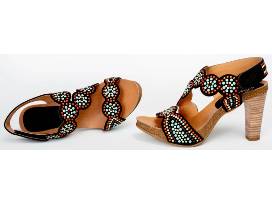 - Soft black suede leather heels with turquoise, coral & white stud pattern.