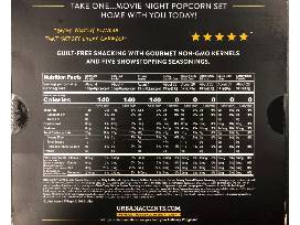 The popcorn kit from Urban Accents contains white cold kernels, ruby red kernels, and tri-color kernels. Their decadent seasonings include: Buttery Caramel Corn, Sweet & Salty Kettle Corn, Sizzlin' Spicy Sriracha, Spicy Chili Lime, Cheesy White Cheddar.