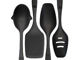 Nuwave Kitchen Utensil Set with built-in counter rest. Comes with a ladle, solid spoon, slotted spoon, and spatula.