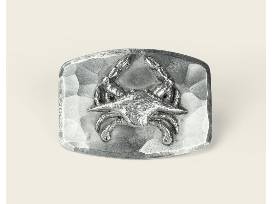 This forged crab belt buckle is another creation by blacksmith, Wes Groot at CityBoy Forge in Chicago for Howler Brothers. Wes crafted a glorious crustacean in pure sterling silver laid on a bed of silver plated, recycled steel.