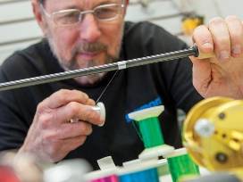 With his customers, Drumheller finds out what they're fishing for, drilling down to specifics such as preferences for lengths, sizes of handles, even whether they want cork, foam, or wood grips. Customers can even select the kind of wood-for example red cedar, which is light, or even pecan or persimmon or other varieties-that he turns on a lathe at his home.
