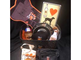 Tito's Handmade Vodka is the Vodka for Dog People! Take home this amazing basket with goodies for both humans and puppies! Includes Tito's Dog Toy, Food Bowl, Leash, Mat, Tin Sign, Tote Bag, Fanny Pack, 1L Vodka and more!