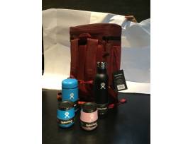 Hydro Flask backpack and assorted flasks, wine bottle, wine glasses
