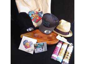 Good Vibes package is a canvas tote filled with an avocado wood shaped bowl sourced from Jason's avocado grove, wallet made from stage tour banners, signed Know CD, signed electric guitar pic guard, three Mraz Family Farms chocolate bars, Good Vibes hat, and beanie. Brixton Fedora hat.