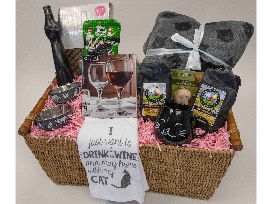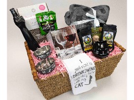 Enjoy a special night in with your favorite cat with this basket, including Moselland Black Cat Wine, a set of 4 wine glasses, a blanket/pillow set, a black cat mug, 2 bags of Farmer's Market Collection ground coffee (Peanut Butter Cup, Macadamia Nut), a cat scratcher, a cat toy, 2 Polka dotted cat bowls a kitchen towel set, and a bag of black licorice shaped like beagles.
