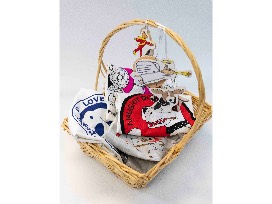 Reusable Binky and Bell tote bag including 6 wooden dog ornaments and 3 large t-shirts featuring Binky and Bell designs.
