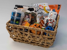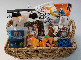 This Halloween themed dog basket includes a kitchen towel set, Boo Bars crunchy dog biscuits, Zooks pumpkin treats, Tricky Treats, Hallows Eve set of four wine glasses, squeaky rope toy, rubber ball toy, Count Dogula mug, dog food samples, and nail polish strips. Wicker basket is handcrafted.