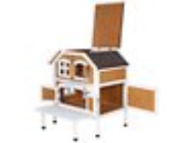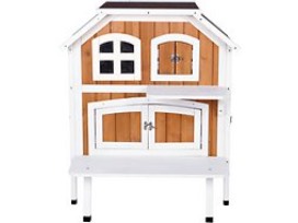 This 2-story cat cottage is a charming addition to any indoor space. Cats can come and go using the front door. Once inside, they can climb, jump and explore between levels. There is also a large side door and hinged roof for quick access and easy maintenance. The latched shutters, window with plastic pane, and lounging porch and perch are sure to entice even the most finicky feline. 30.5 inches wide x 22.75 inches deep x 35.25 inches high