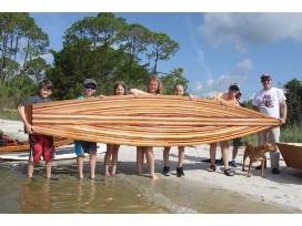 Hand-crafted wooden paddle board 14 foot long by 30 inches wide and weighing 35 pounds. Made at the Big Bend Maritime Center by local and at-risk youth from all locally sourced and reclaimed lumber including sinker cypress and aromatic red cedar. This incredible board is a hybrid with a marine plywood hull and a "strip built" deck meaning there is no paint or stain on the board, it is solely beautiful, natural wood colors.