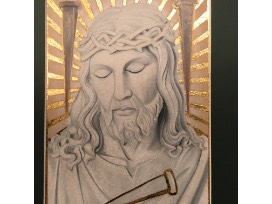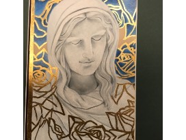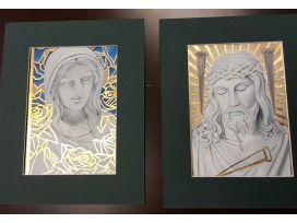 A set of magnificent works of Jesus and Mary from JPII student artist, Sabrina Frazier. Created using gold leaf and colored pencil, they are a set to behold. Mary is surrounded by the 7 roses of sorrow and Jesus, looking to Mary on his right, has the 3 spikes. The two spikes on His right and left represent the 11th Station of the Cross. Both are a little larger than 5" x 7" in size.