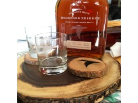 For the ultimate Falcon fan! Liter bottle of Woodford Reserve with Falcon etching. Also, two (2) etched highball glasses and etched wood coasters all on a wood tray.