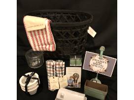 Beautiful black woven Magnolia basket filled with Magnolia home and kitchen decor. Also includes a Joanna Gaines book.