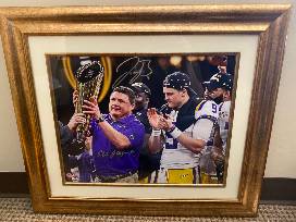 Here is your chance to own a photo of Coach Ed Orgeron receiving the National Championship trophy with Joe Burrow by his side. Signed by both Coach O and Joe Burrow, with a Fanatics Authenicity certificate.