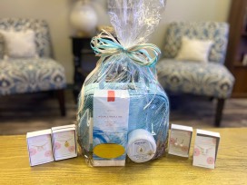 Included in the package from Pink Paisley : a Stephanie Johnson cosmetic bag, Spongelle Body Buffer and Thymes Aqua Coralline body cream.