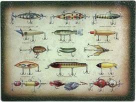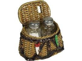 FISHING CAMP KITCHEN DÉCOR Includes 12" x 16" tempered glass cutting board and hand painted fishing creel Salt and Pepper Shakers.