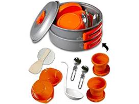 This 13 piece cookware set is great for 1-2 travelers featuring 2 cups, 2 bowls, nonstick pot with lid, frying pan, ladle, sponge, spatula, bag, and stainless steel sporks.