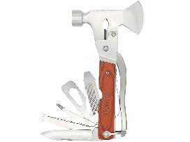 Includes: Hatchet, hammer, axe, knife, screwdriver, pliers, fish descaler, saw, opener bottle, file, scale knife, rasp, wire cutter, Assorted Hex Wrenches and more with a safety lock.