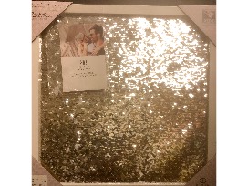 Sequin board is 17" x 17" inches tall. It is magnetic and the sequins are silver and white colors. White frame. Perfect for hanging pictures, drawing shapes, or whatever you want.?