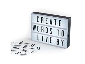 LED marquee lightbox to create your own personalized DIY signs. Includes 100 letters, numbers, and character tiles. Table top or wall mountable; 12"x9". Sliding battery compartment (6xAA not included) or USB powered (USB included)