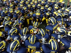 The Michigan Wolverines football program has the most all-time wins in college football history. The team is known for its distinctive winged helmet, its fight song, its record-breaking attendance figures at Michigan Stadium, and its many rivalries.