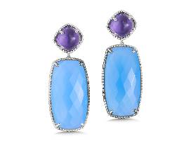 Sterling silver pineapple-cut blue chalcedony and cushion-cut amethyst cabochon earrings and pendant from Kaplan's Fine Jewelry of West Chester.