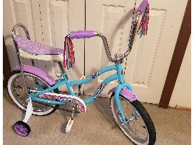 Schwinn Coronet 16" sidewalk bike in blue and purple. High-tensile steel kids' frame with included training wheels.