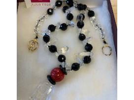 This beautiful necklace is made with a quartz crystal Buddah and beads and has a hand carved chinese "faux" coral glass with black onyx. It is also hand knotted.