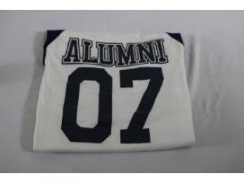 Small blue and white alumni baseball tee.
