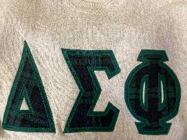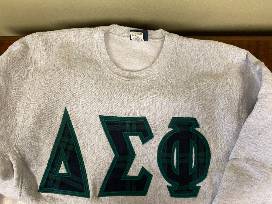 Relax in a large size crewneck sweatshirt featuring green plaid Delta Sigma Phi greek embroidered letters.