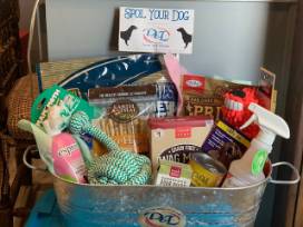 Chiock full of dog treats, toys and items for any discerning dog owner. They will love this basket.