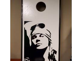 A set of cornhole boards depicting silhouettes of Guns and Roses stars Axel Rose and Slash. Comes with set of 8 bags.
