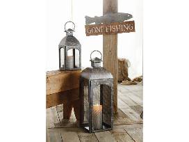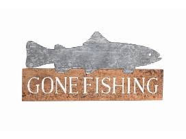 Distressed mango wood plaque features printed "GONE FISHING" sentiment, corrugate galvanized tin fish icon and arrives with sawtooth hardware for hanging. Dimensions: 10" x 20"