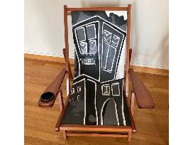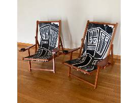 TeenForum (Flynn Scorzelli and Josephine Kytta) (TEEN 17-18)- Two Outdoor slingback-style chairs with wooden frames and painted black, white, and grey material as the seat.