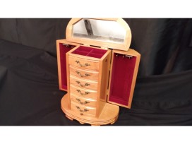 The 9 different compartments have red velvet lining - for your rings, to hang necklaces, etc. Top compartment opens to reveal a convenient mirror.