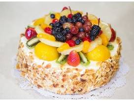 The base is a classic genoise sponge cake, layered with a whipped cream-custard cream mousse and studded with sliced strawberries. A coat of silky smooth vanilla buttercream and slivered toasted almonds encases it all, but the veritable fruit basket on top makes this cake memorable.