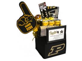 Show your commitment to the #PurdueFamily with this ultimate "Boiler Up" fan basket. Four (4) tickets to the football home opener vs. Vanderbilt on Saturday, September 7 at noon with a Parking Pass (Section 128, Row 44) ...check! Six pints of Boiler Gold - the school's first, sanctioned signature beer - from People's Brewing Co in Lafayette.....also check! Boilermaker Special logo Tervis tumbler, fleece throw, and peel & stick eye strips...included! Motion P logo car flags, mini football, window cling, and crate...they're all here too! And don't forget the "Hammer Down" foam finger as well as a t-shirt that will have you cheering all year 'round.