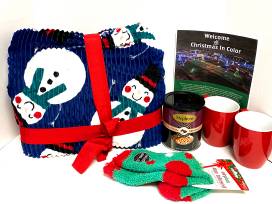 Auction includes $25 admittance to Christmas in Color, a 50"x60" Christmas throw, Stephens gourmet hot cocoa with marshmallows, 2 red hot cocoa mugs, and a pair of aloe-infused Christmas socks.